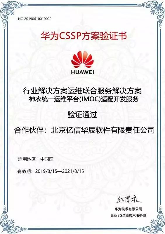 億信BI部分可視化案例 億信BI產品簡單易用且擴展性強。在IMOC“監、管、控、營、服”一體化體系中,億信BI主要負責IMOC中 “營”——智能分析運維可視化功能模塊(eSee)的工具支撐,實現了IT運維、故障診斷、性能容量、業務服務、運維服務等內容的可視化分析展現。在“可視化”方面,IMOC平臺提供了6大運營專題、全域度量體系,讓用戶對海量資源了如指掌,支持毛細血管級可視。 近期,億信華辰還通過華為IMOC適配開發服務的CSSP伙伴認證。這也意味著我們與華為有了更深入的合作,不僅是產品工具的合作伙伴,同時也是實施開發服務的合作伙伴,將來可以在IMOC項目中提供可視化相關的實施開發服務。 華為CSSP方案驗證書 小結:IT運維與企業數字化運營緊密相連、息息相關。企業運維是一個系統性、生態型工程,億信華辰愿攜手華為及眾多合作伙伴,基于大數據,讓企業運維成為水電一樣的基礎服務,為客戶提供更全面的運維轉型方案,助力客戶業務持續穩定發展。