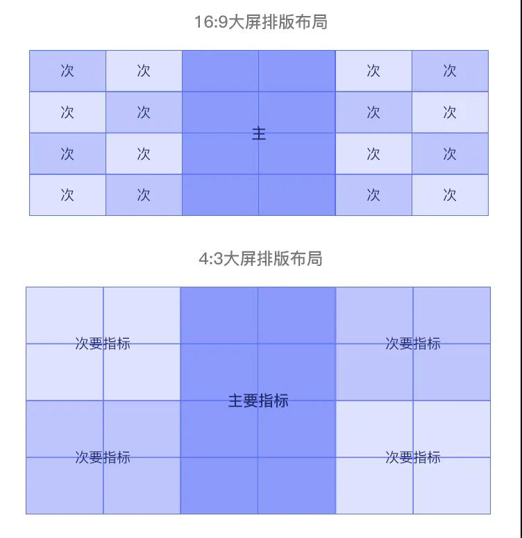 大屏可視化由于承載體的特殊性,有時(shí)候一個(gè)小小的差錯(cuò)會(huì)使得效果千差萬(wàn)別,如果客戶是4:3的屏,你大筆一揮設(shè)計(jì)成16:9的,那個(gè)壓縮效果不忍直視,怕是需求方要追著你打。所以做好前期調(diào)研很重要,包括大屏比例、材質(zhì),在哪里演示,對(duì)何人演示,有什么目的等。 下圖是不同比例大屏的分布策略,可供參考: