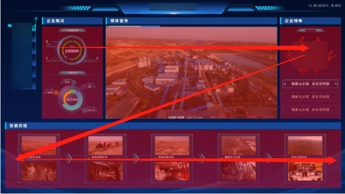 該類型主要是依靠建設(shè)一條完整的視覺導(dǎo)線,引導(dǎo)觀看者從一端往另一端吸收信息,該構(gòu)圖簡(jiǎn)單易懂,比較適合有嚴(yán)格順序的數(shù)據(jù)信息,例如企業(yè)的展示大屏等。